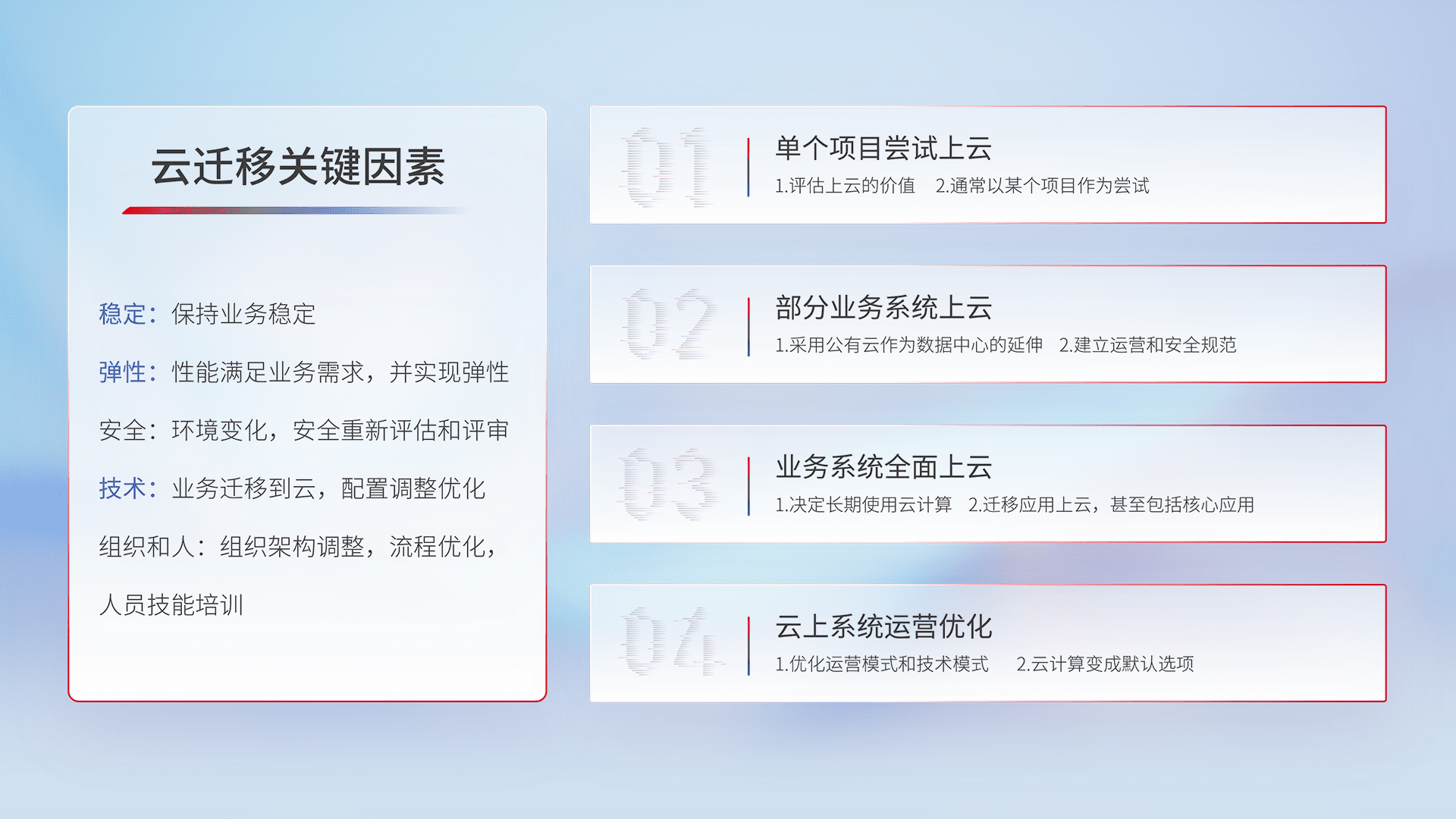 结合实际业务,,,从规划设计、、云平台选型、、、云原生改造、、、、数据迁移、、、、集成交付,,,,迁移全过程为客户识别最佳上云路径,,,做好风险识别管理,,设计网络架构、、、身份权限、、、、安全审计合规、、、操作审计、、、、日志审计、、、、监控告警策略、、、、多站点容灾设计等,,,对云上基础设施进行整体规划,,提升IT治理水平,,,以满足弹性、、高可用、、、高性能的需求。。。。