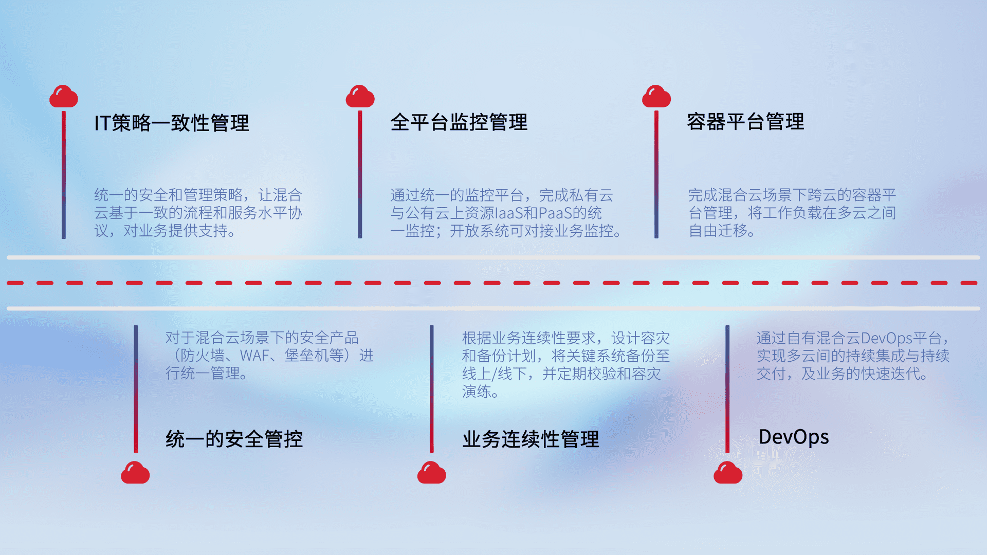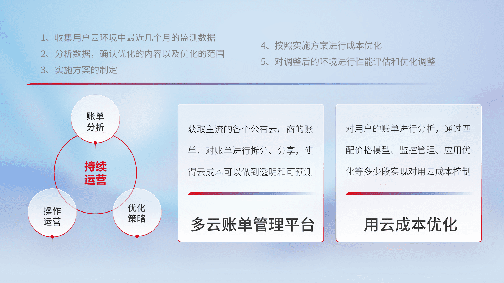 通过多云纳管,,以统一的资源数据模型把客户的云资源进行抽象和封装,,进而实现对多云资源的统一操作,,,保障云资源管理的可靠性、、、稳定性与可用性。。。。量身定制化运维内容,,,,配置、、开发运维、、、、补丁管理、、备份、、、、监控、、、认证和访问管理、、、、审计和日常巡检等,,,,保障在用云过程中的可靠度,,,,稳定度以及高可用率。。